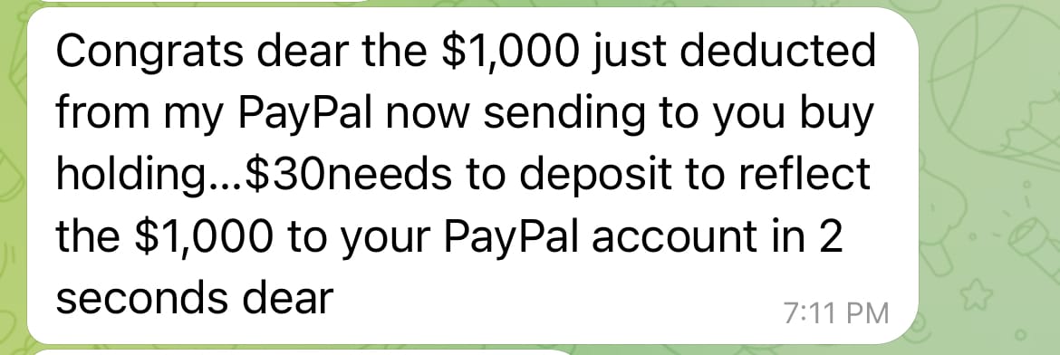 These fees will begin small, but they can add up to hundreds or even thousands of dollars. Each time they will tell you that the “next payment will be the last” before you receive your $1000. But of course, the money never arrives. By the time you realize something is amiss, you may already be out of pocket hundreds of dollars. Even worse as you sent the money through “Friends and Family” there isn’t any recourse, and no chance to get a refund from your bank or credit card company.