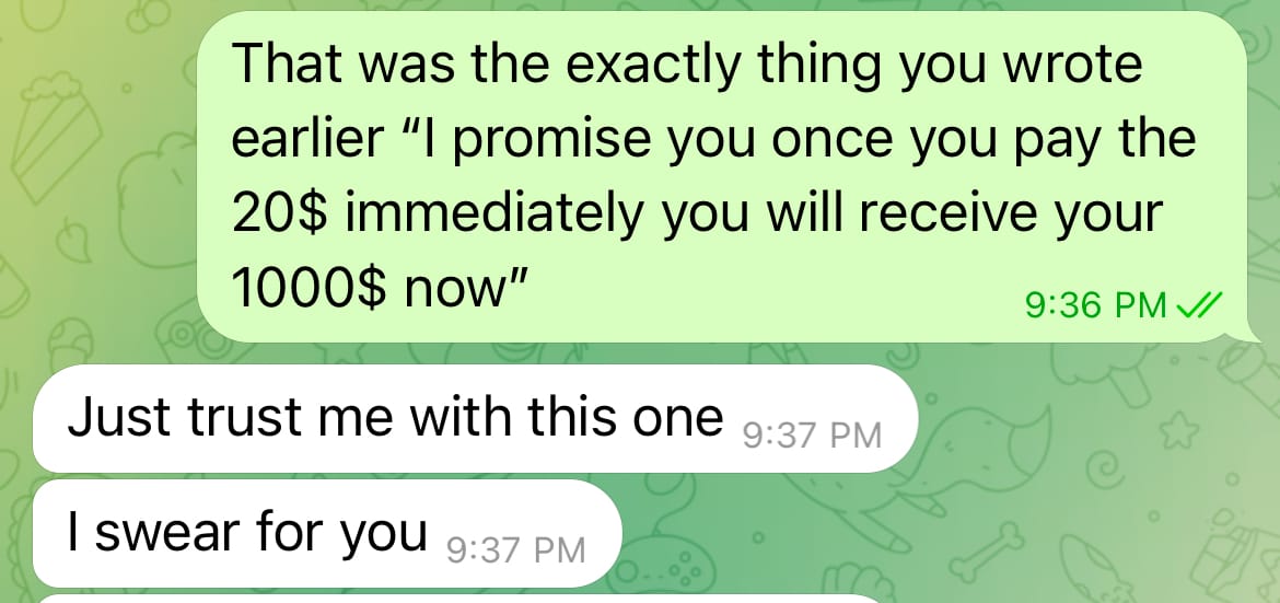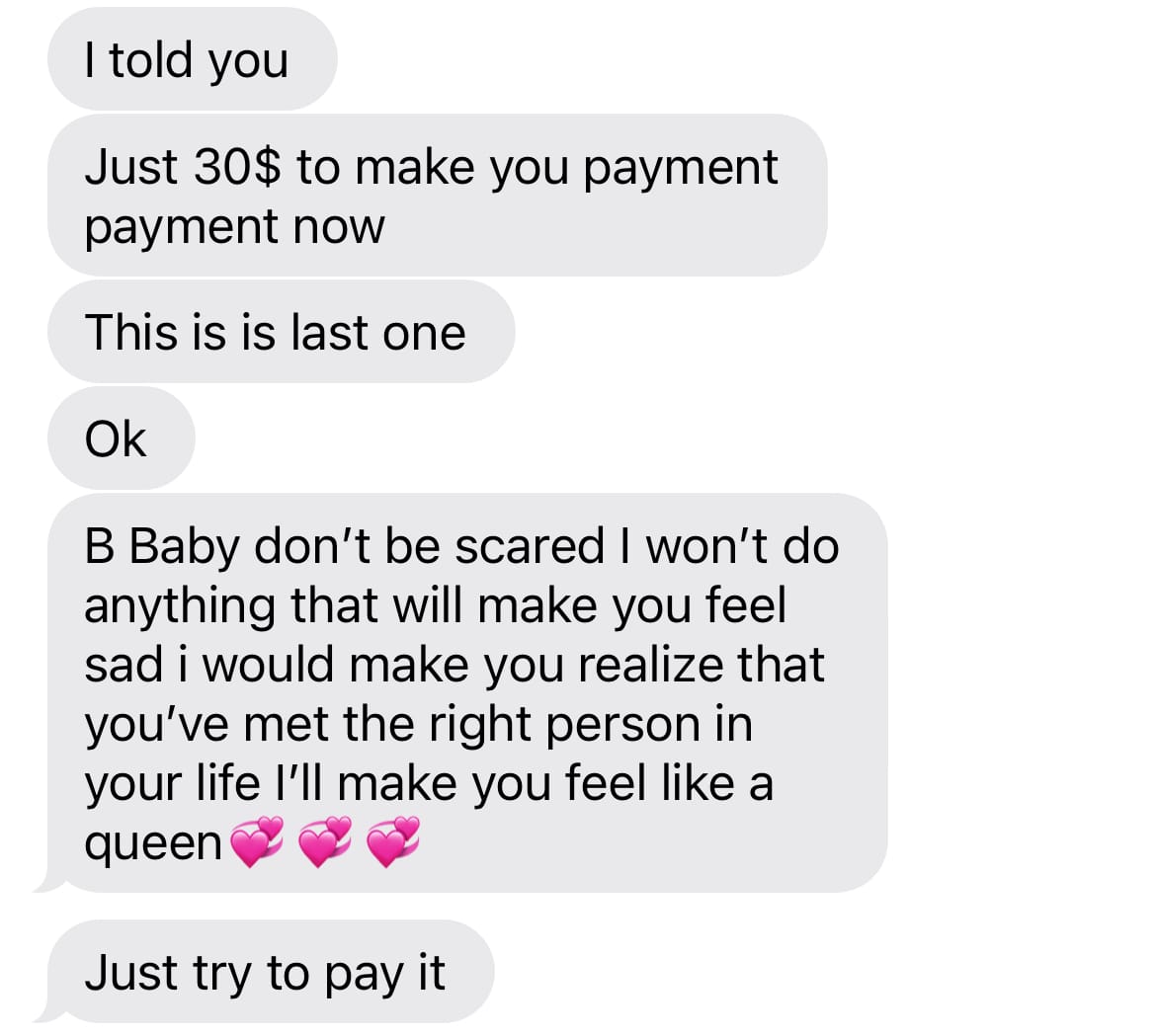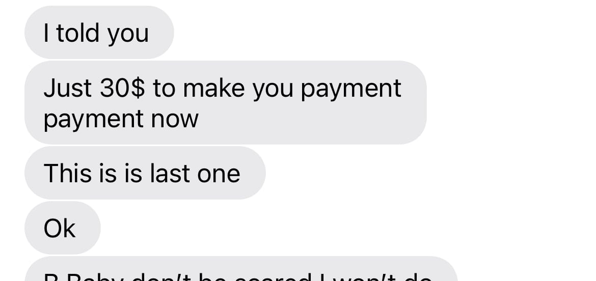 The scam is far from over after you make that first $20 payment. The scammer plans to keep you involved and asking for more money.