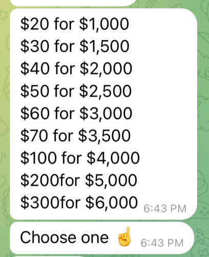 In my case, the offer was to send $20 to a PayPal account to receive $1000 in return. However, what was even more appealing was that they had a menu of support programs – $30 for $1500, $50 for $2500, and even $300 for $6000. Sounds tempting doesn’t it? After all, it’s only $20.