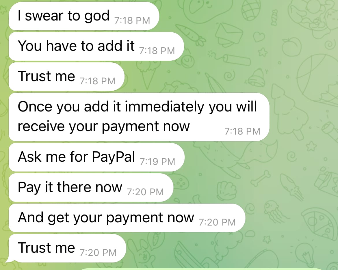 They will ask for additional money for ‘marketing fees’, to pay charges to ‘release funds’, account chargebacks as the charge didn’t go through, ‘transaction verification’ fees, and even apologize, that their “Manager needs to be bribed”. They will use words like trust, I promise, even suggest that as they are Christian, it is a sin to lie and send you scripture “I’m a good Christian and God fearing person and i know what the bible says about stealing, take a look at this Bible verses Ephesians 4:28, Exodus 20:15 and Romans,I’m not a scammer and i will never be one till i die.. in”. In my case they even sent screen captures of a draft transaction to my PayPal account showing the amount to be deposited.